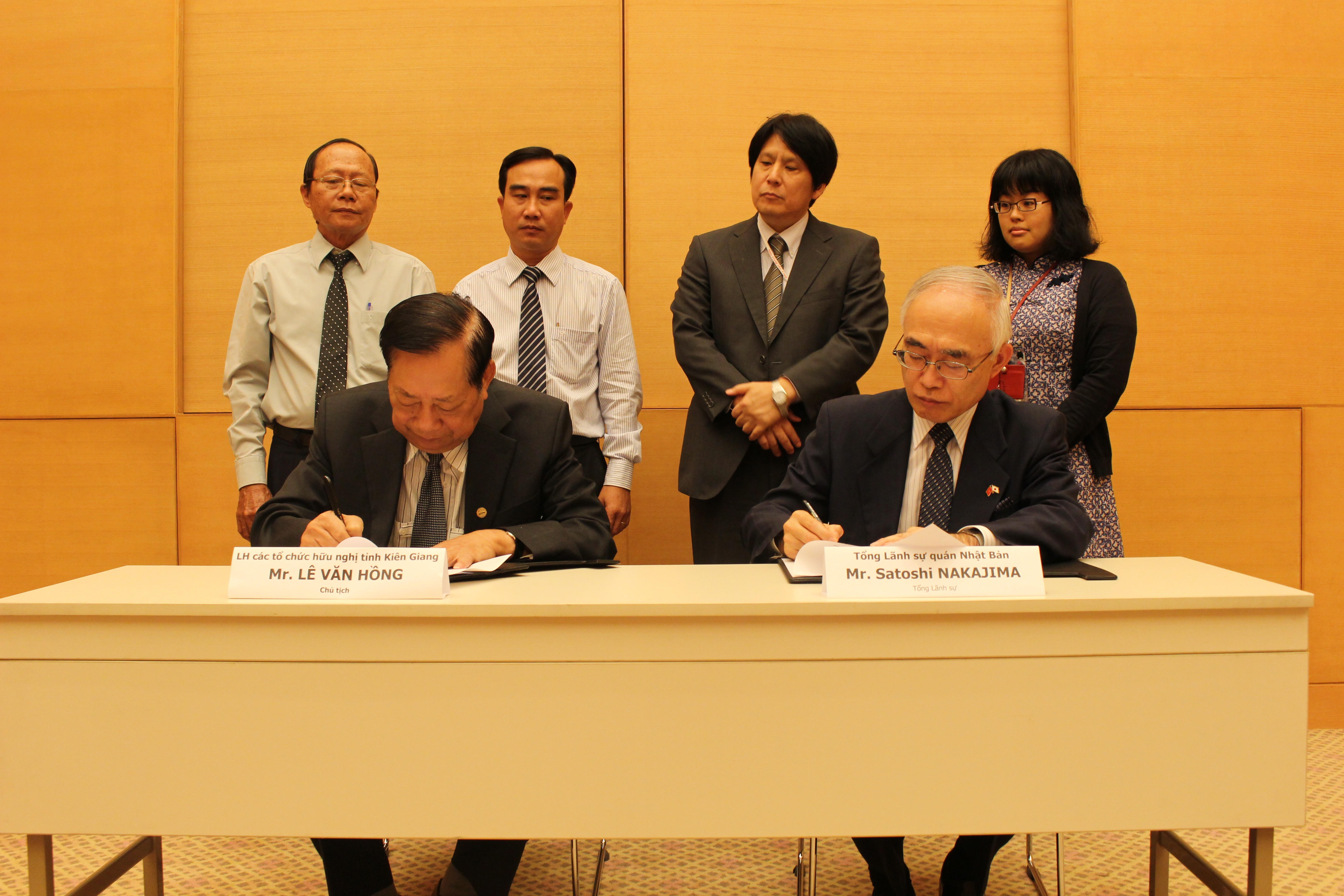 Tại buổi lễ, Tổng Lãnh sự NAKAJIMA đã ký hợp đồng viện trợ cùng 6 đại diện của các đơn vị.